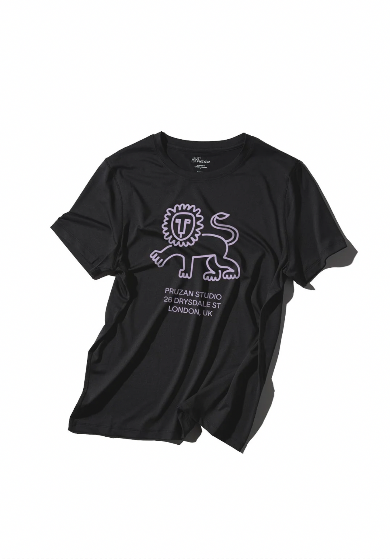 Pruzan Studio Lion T Shirt in celebration of our flagship location in Shoreditch, London. Lion artwork by team Pruzan. Featured in a lilac iris shade and printed on the Pruzan Marathon T Shirt for a performance-ready style.