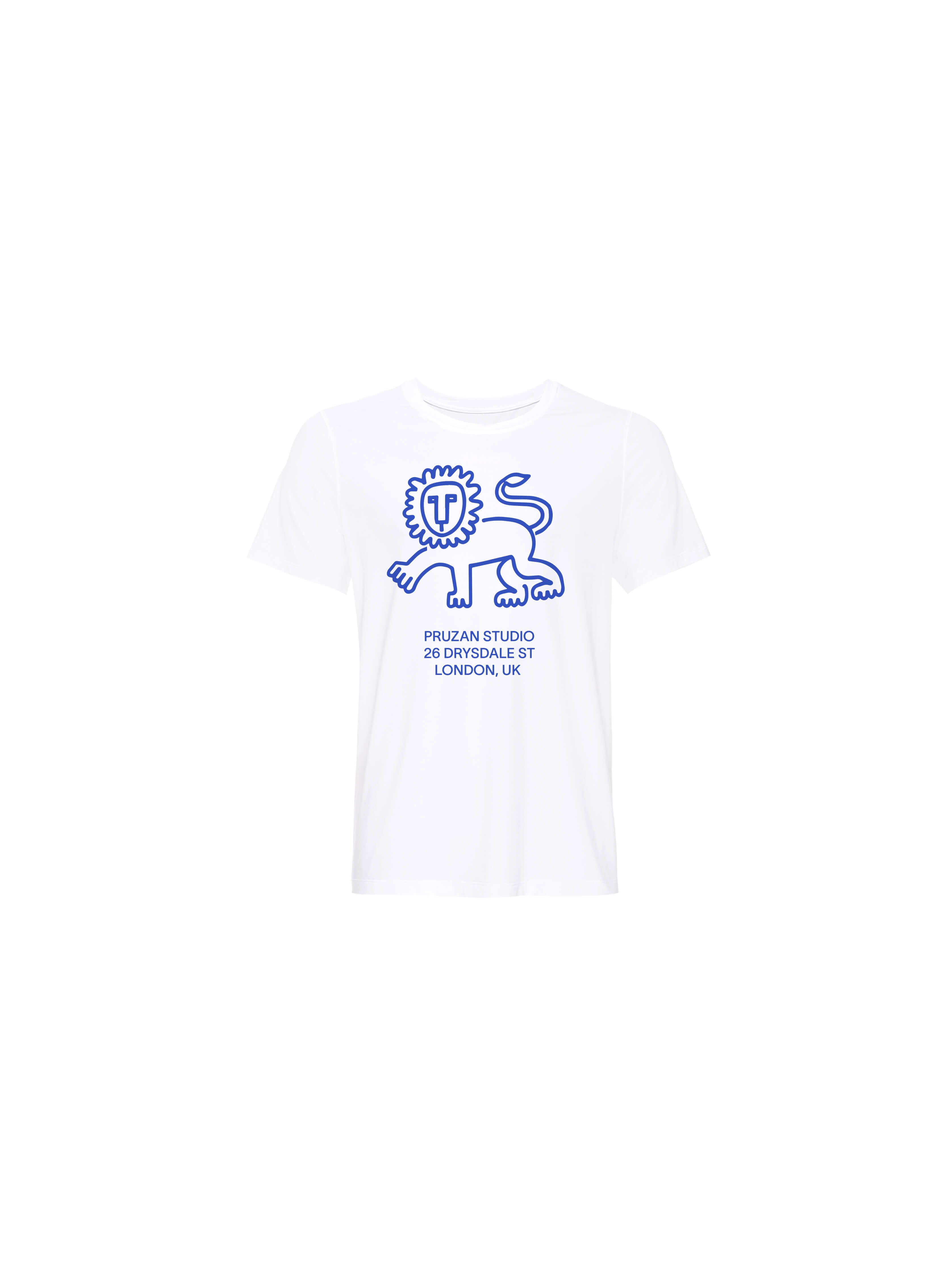 Pruzan Studio Lion T Shirt in celebration of our flagship location in Shoreditch, London. Lion artwork by team Pruzan. Featured in a bold cobalt blue inspired by the Super Blue Moon and printed on the Pruzan Marathon T Shirt for a performance-ready style.